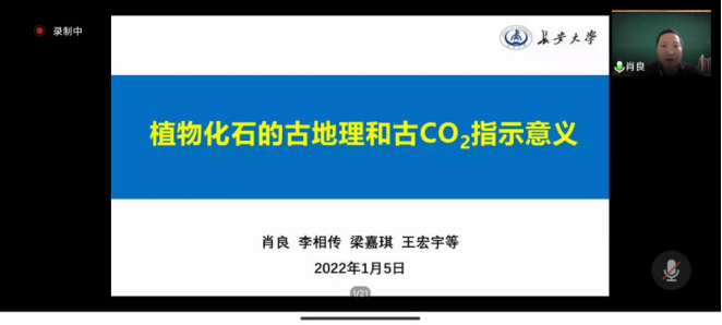 肖良副教授从化石的研究意义、植物化石的古地理指示意义和植物化石的古CO2指示意义三个方面进行讲述。肖老师首先讲述化石在生物大灭绝、地层划分和对比、全球板块运动以及生物与环境中的研究意义;通过浙东嵊县植物群和蒙中二龙山植物群两个实例对植物化石的古地理指示意义进行阐述;结合近年来温室气体的增温效应及快速增长,引出对地质历史时期CO2和温度变化趋势的思考,并就三种基于植物化石重建古CO2的方法进行阐述。最后肖老师鼓励同学们坚持抗疫,相信在不久之后疫情就会过去。