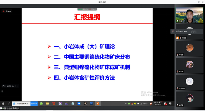 焦建刚教授从小岩体成(大)矿理论、中国主要铜镍硫化物矿床分布、典型铜镍硫化物矿床成矿机制、小岩体含矿性评价方法等四个方面进行阐述。焦老师首先讲述小岩体成大矿理论的涵义以及科学问题,接着介绍世界主要的铜镍硫化物矿床,重点讲述中国主要铜镍硫化物矿床分布;随后以金川超大型铜镍矿床和喀拉通克铜镍矿床为例,深入介绍了铜镍硫化物矿床的成矿特征和成矿机制;并围绕小岩体含矿性评价指标对小岩体含矿性评价方法进行详细介绍;最后鼓励老师同学们建立信心,遵守防疫政策,并建议大家把握好这段时间,为后续科研工作做好准备。