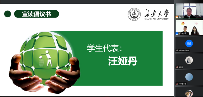 2021级学生汪娅丹同学作为学生代表宣读了世界地球日倡议书,她倡议所有同学积极树立人与自然和谐共生的理念,投身生态环保实践,为建设美丽中国汇聚青春力量。