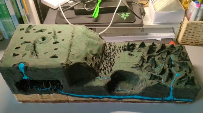 作品简介:模型主体分为地上地下两个部分,采用剖面的形式展示喀斯特地貌在水平方向上分为三个部分,以全面展示喀斯特地貌的整体景观。