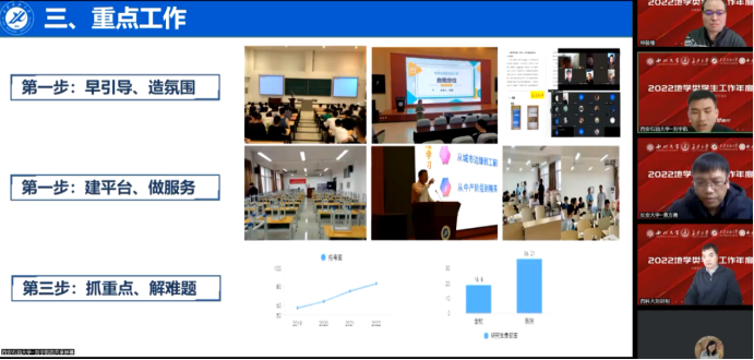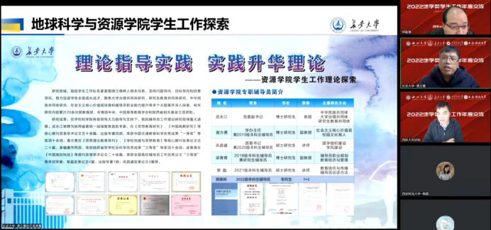 学工办主任查方勇,西安石油大学地球科学与工程学院辅导员刘宇航分别介绍了各自单位党建和学生工作的开展情况。