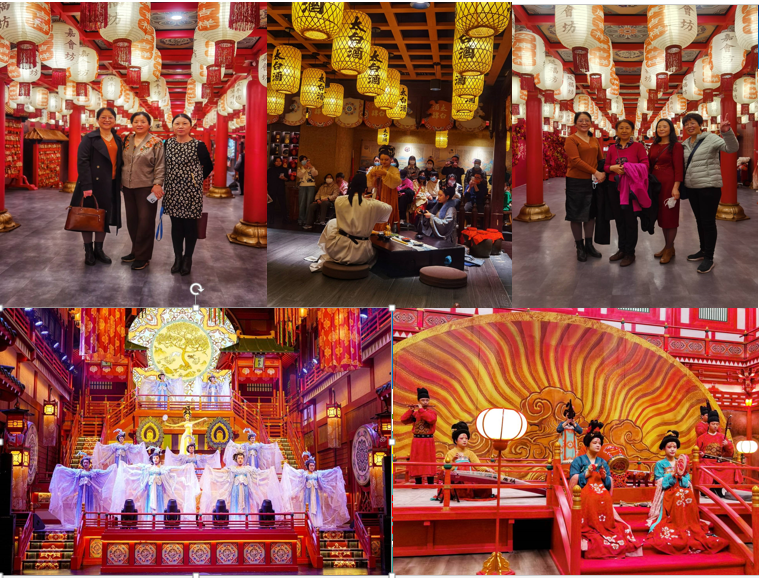 活动分两部分展开,首先跟随讲解人员,了解“长安十二时辰”各街区文化内涵,随后依据个人喜好组团观赏演艺节目。“长安十二时辰”主题街区在整体规划设计上将科技与历史相融合,将主题景观、演艺内容、商户业态等有机融合在一起,为前来者带来身临其境的奇幻体验。街区内日晷、吉凤、红龙、太上玄元灯、踏歌台、花萼相辉楼、望楼、靖安司等场景让女教工们全方位、全体验、全身心的沉浸在唐朝之旅中,进而进一步产生对西安这座城市的浓厚兴趣。