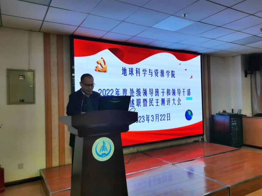 党委书记黄喜峰首先代表学院领导班子述职。他从党建工作、行政工作、学生工作、工会工作等方面汇报了履职情况,肯定了学院2022年度各项工作取得的突出成绩,指出了学院发展目前存在的问题,针对这些问题提出了相应整改措施。新的一年,他号召全体教职工,要以习近平新时代中国特色社会主义思想为指导,全面贯彻党的二十大精神,充分把握新一轮“双一流”建设和“十四五”事业发展等叠加机遇,踔厉奋发、笃行不怠,为早日建成特色鲜明、优势突出、行业知名、发展势头强劲的现代地学学院而努力。