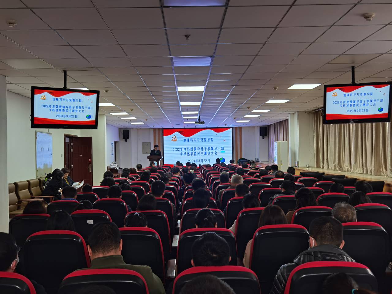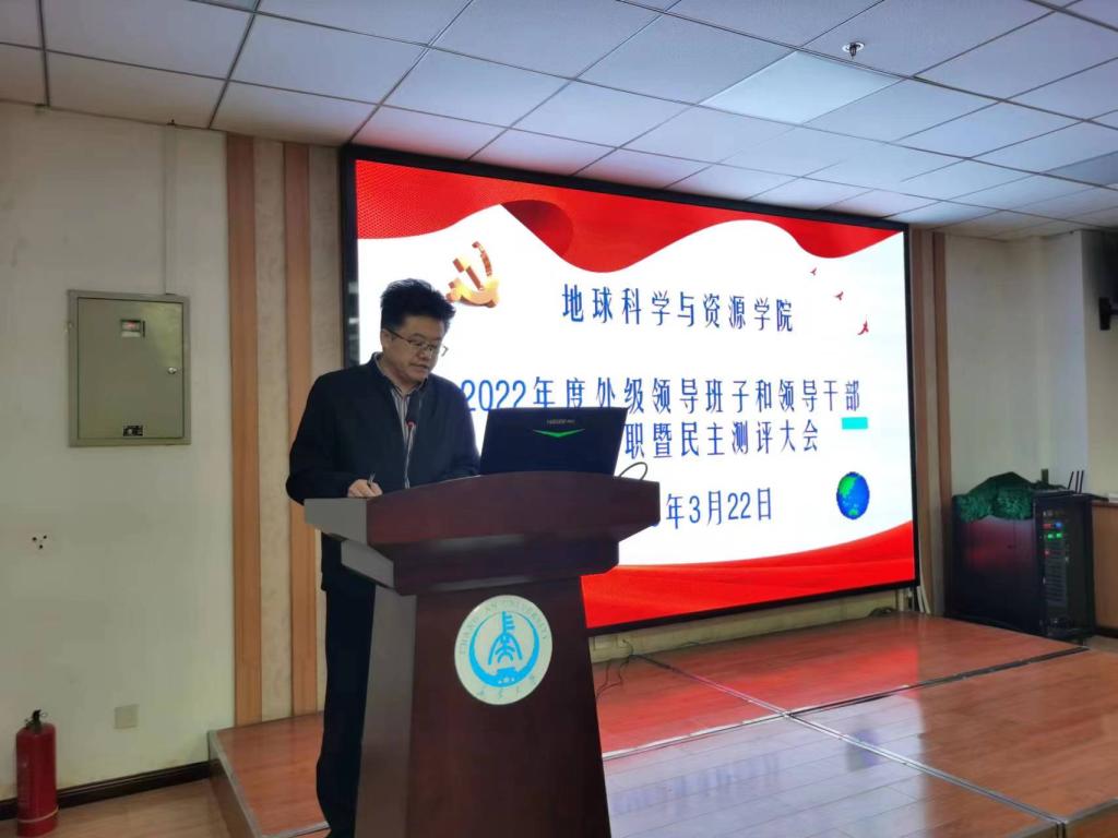 在雁塔校区地学大厦三楼学术报告厅召开了2022年度处级领导班子和领导干部考核述职暨民主测评大会。学院全体处级领导干部和教职工共106人参加大会。大会由院长李荣西主持。