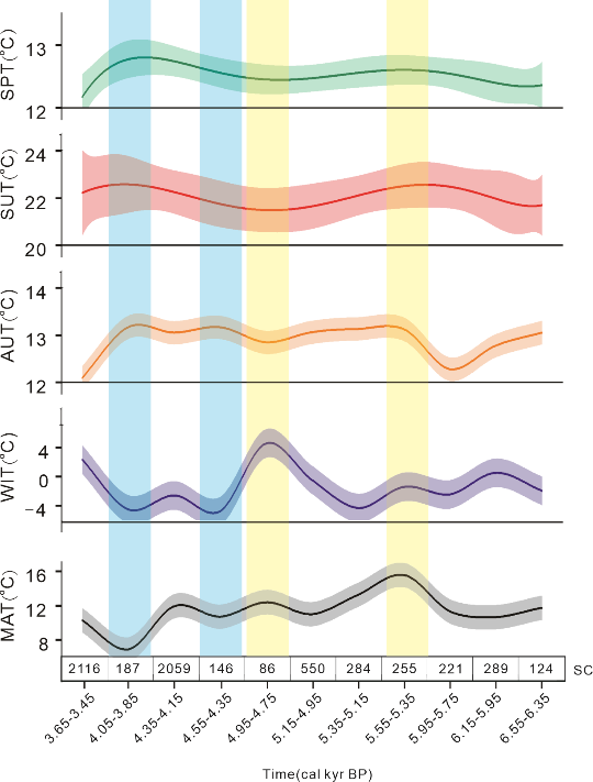 植物的生长对季节性温度的响应十分敏感(Miller et al.,2010;Birks et al.,2010; Shakun, 2018),本研究以植物遗存—木炭作为代用指标探讨了东亚地区全新世中期(6.55-3.45 cal Ka BP)季节性的温度变化。重建结果表明关中地区全新世中期以来四季温度存在显著波动,季节性温度和年均温度均在5.55-5.35cal ka BP之间存在暖高峰,其中冬季温度的变化趋势与年均温的变化高度吻合(图1)。近70年年均和四季的温度变化趋势(图2)也显示冬季温度的变化与年均温变化同步。全新世中期以后冬季日照辐射的显著增加(Laskar等人,2011;Pang等人,2020),可能是全新世中期以来冬季温度变化对年均温的贡献率增加的主要因素。该工作为解疑“全新世温度谜题”提供了重要参考。