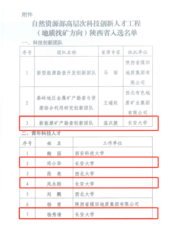 温汉捷教授等组成的“新能源矿产勘查创新团队”入选科技创新团队,邓小华、凤永刚、杨秀清三位教师入选青年科技人才。