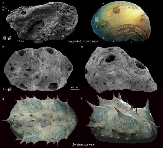 强亚琴博士等在湖北三峡地区寒武纪第二期(5.29亿年前)地层中发现一种微体化石贝雷虫( Beretella spinosa )。贝雷虫长度在1-3毫米之间,形如其名,前尖后钝,前低后高,整体形态像一顶贝雷帽,因此得名。其凸起的弧面覆盖两侧对称排列的刺状骨片,骨片沿着动物的前后方向纵向分布。较扁平的一面保存差,可见一个大的残缺的开口。形态上,贝雷虫明显属于两侧对称动物。功能上,一般底栖生活的两侧对称动物中刺状骨片具有防御作用且多发育在背部。因此,背部更硬也更易保存下来。另外,所有两侧对称动物毫无例外都发育口。贝雷虫背部没有口,那么口只能存在腹面残缺开口的内部(图2D-G)。
