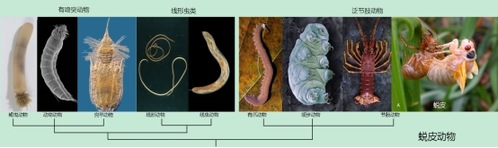 蜕皮动物是地球上数量最多,种类最丰富的无脊椎动物,并占据了海陆空各种生态位,因为在生长发育过程中经历多次蜕皮而得名。常见的有各种昆虫、螃蟹、以及号称杀不死的水熊虫等。除此之外,还有一些鲜为大众所知的海生类型,比如发育可外翻、内缩吻部的鳃曳动物、兜甲动物、动吻动物以及长腿的天鹅绒虫(图1)。
