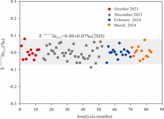 该文章提出了一套新的铟同位素分离、测试方法,该方法可有效对地质样品中的铟进行提纯,可实现铟同位素的精确测定。通过分析每一步洗脱液的In同位素组成,发现在铟的回收率高于93.8%时,分离过程中产生的铟同位素分馏在误差范围内可忽略不计。文中提出的分离方法,可有效剔除样品中的干扰元素,且铟的回收率可达到98±2%,完全符合测试要求。对于在测试过程中仪器产生的质量分馏,文中采用了Ag掺杂法和SSB法进行矫正。通过对不同浓度的标准样品进行测试分析,发现Ag掺杂法的测试精度与稳定性明显优于SSB法,样品的上机浓度可低至1ppb。文中提到的测试方法对样品与标准的浓度匹配要求较低,在测试过程中只要控制样品与标准的浓度差异<30%,即可确保样品的精确测定。该工作为铟同位素在地学不同领域的应用提供了解决方案。