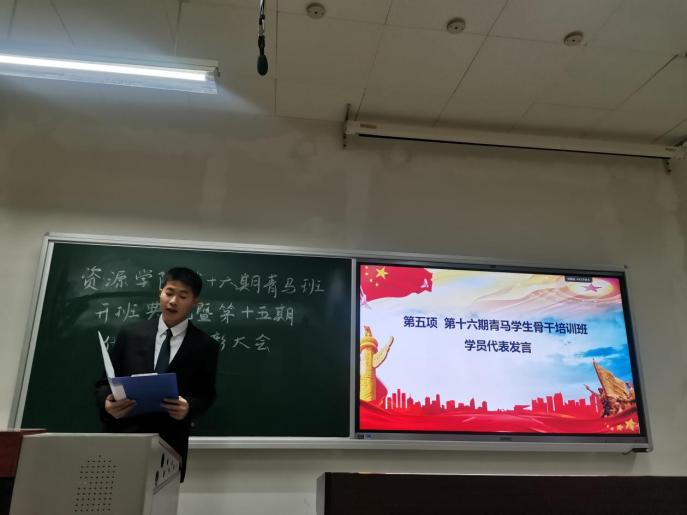 第十六期青马学生骨干培训班学员代表蒋浩雄发言。他表示会严格遵守培训纪律,认真参加培训,勤学勤思,努力提升个人综合素质。