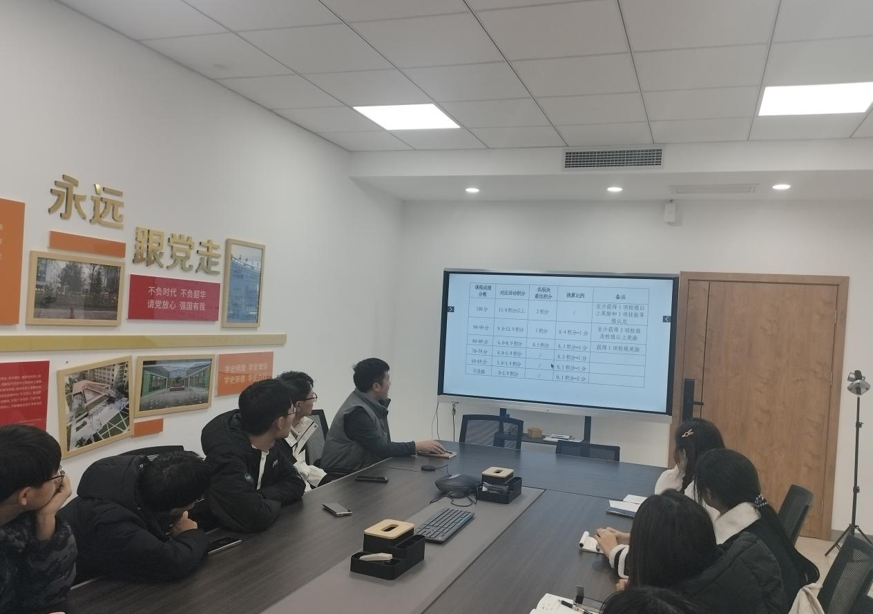 本科生素质拓展实践课程管理办法》文件内容,讲解了素质拓展实践课程的重要意义,要求团学干部积极在班级中开展宣讲,督促同学按照要求顺利完成学习内容,锻炼个人能力与提升自身素质。他还介绍了学生干部对于班级建设和团学工作顺利开展的重要作用,讲述了学院许多优秀学生干部的先进事迹,号召大家向榜样学习,不断推动学院团学工作高质量发展,为学生成长成才创造良好环境。