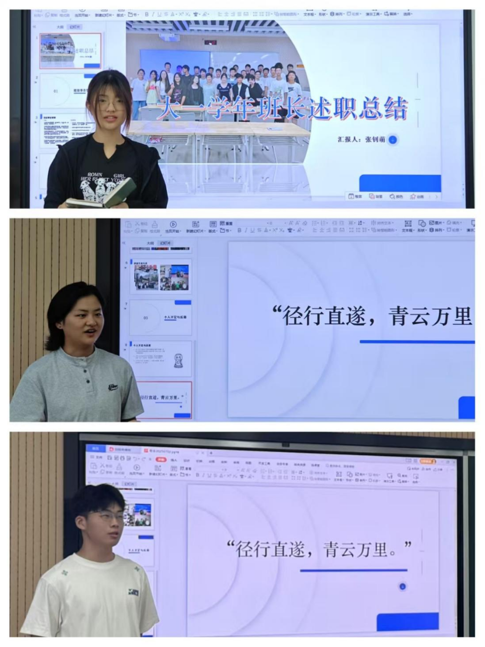 班长张钊萌梳理班级学习生活情况,作出个人反思与未来展望。团支书张雨轩总结团日活动成果,强调集体荣誉并致谢。宣传委员于家铭汇报班级活动宣传总结。
