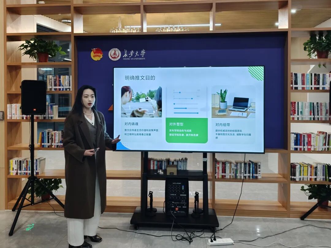 例会明确了各部门职能与要求。主任贾怡雯介绍新闻推文“及时准确传递学院动态与成果”的核心目的,拆解公众号发布全流程,要求成员在各环节精益求精;摄影部部长于家铭从拍摄角度、主角捕捉等维度,讲解新闻配图拍摄技巧与质量要求;视创部部长龙星竹表态将提供技术支持、解答问题;运营部部长武晓东概述运营核心作用,明确部门承担协调沟通、后勤保障等职责。